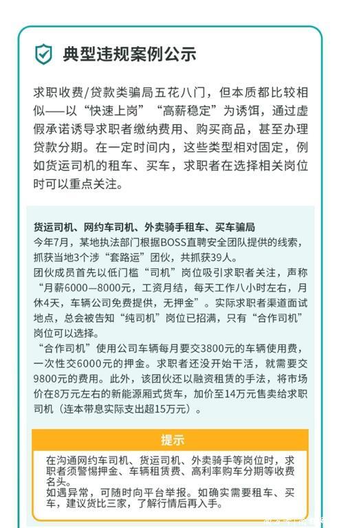 BOSS直聘辅导求职者:在雷同网约车司机、货运司机、外卖骑手等岗亭时,求职者须警惕押金、车辆租出费、高利率购车分期等收费名头。