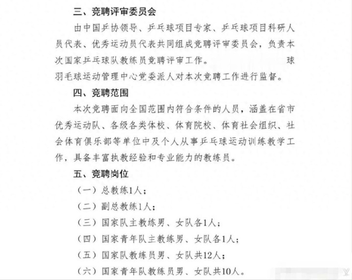 跟着前几日wtt香港总决赛的鸿沟,乒乓球名堂2025赛季就负责落下帷幕了,也即是在这个本事中国乒协终于公布了对于举行洛杉矶奥运周期国度乒乓球队教训员竞聘的见告。