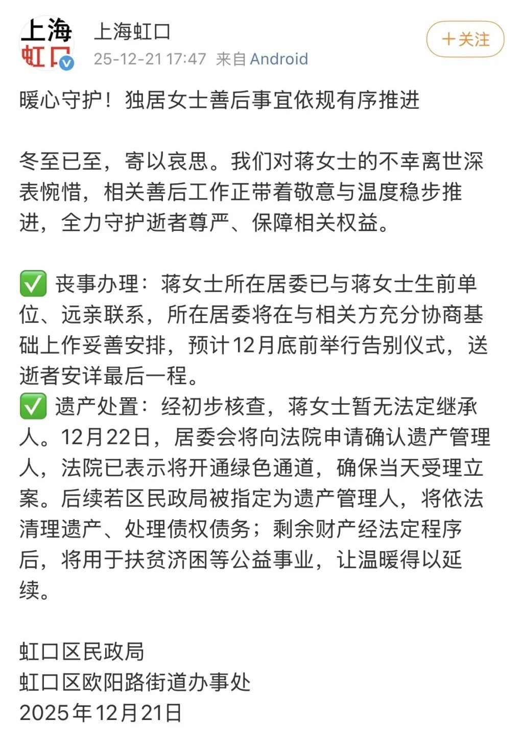 12月21日,@上海虹口 官方微博发布音尘,对蒋女士的横祸离世深表惘然,干系善后使命正带着敬意与温度稳步鼓吹,全力守护死人尊荣、保险干系职权。